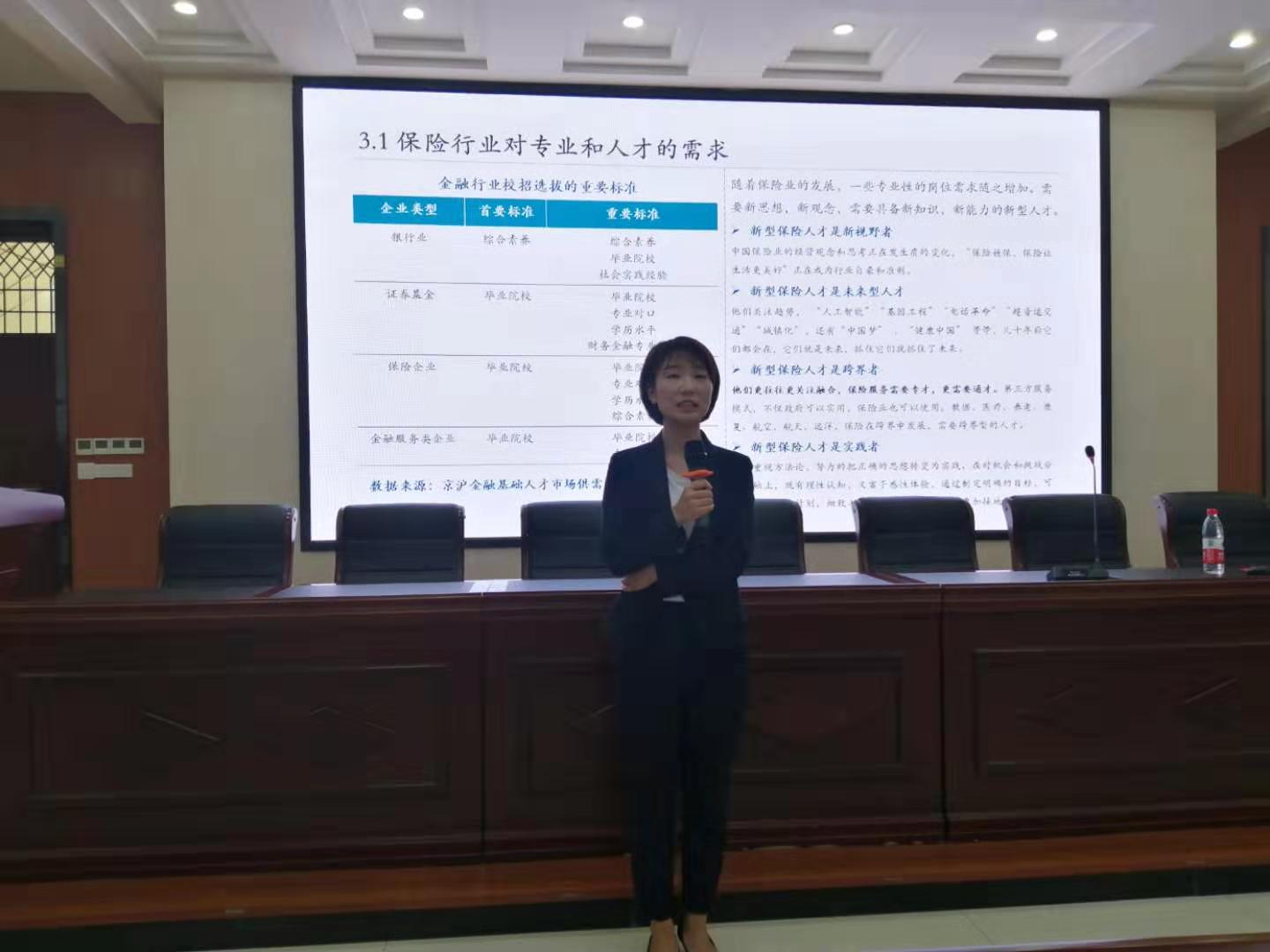 为了加强员工对保险专业的认识,学院特邀请中国平安财产保险有限公司河南分公司梁中伟总经理做了专题报告会,梁总从保险的功能作用,保险的趋势和保险公司对人才的需求特点等方面介绍了“保险那些事儿”,并与2018级金融学类同学做了交流互动,给同学们带来对保险的全新认识。公司保险学优秀毕业生代表谢聪分享了入职平安财产保险公司一年多的心得体会。何绍慰老师主持了专题报告会,并做总结发言。