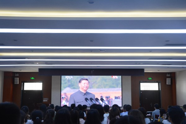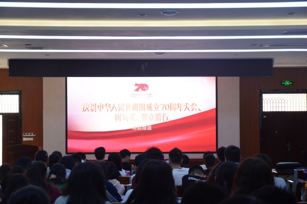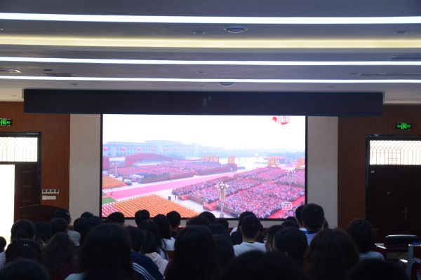 早上八点半,报告厅就已座无虚席。大家都期待着见证那神圣而又庄严的时刻,体验作为一名中国人的骄傲。在大屏幕前,大家跟着直播的步伐,一同回顾了新中国成立以来翻天覆地的变化,聆听着无数中国人诉说对祖国的祝福。熟悉的《我和我的祖国》响起,民族自豪感油然而生。