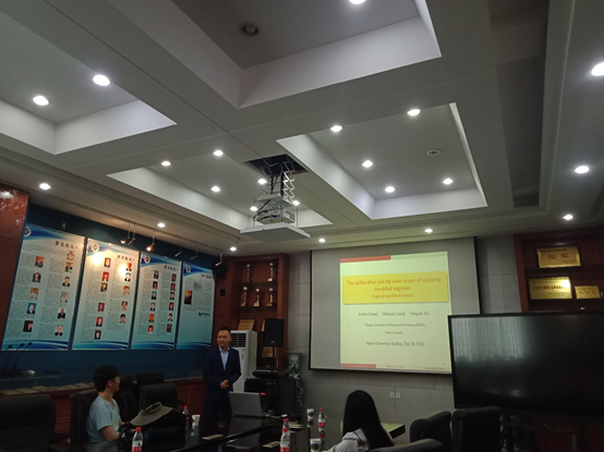 9月18日下午,东北财经大学高等经济研究院常惠斌老师应邀到公司作了题为“The welfare eect and the wider impact of regulating low-skilled migration” 的学术报告。公司杨荷教授、Young Bin Ahn 教授以及部分员工参加了讲座。本次讲座由Young Bin Ahn 教授主持。