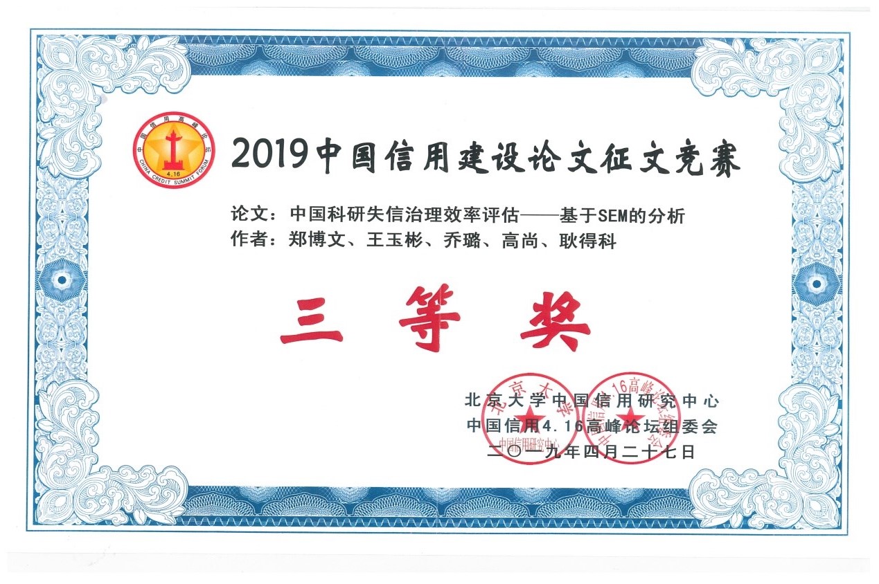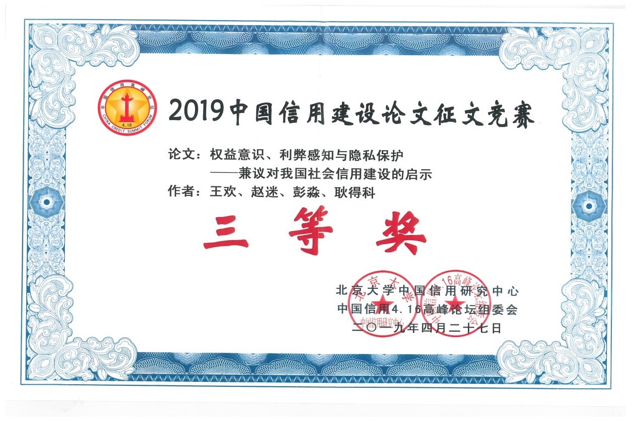 经过历时近1个月的专家评审,公司王欢、郑博文等7位本科生提交的2篇论文均获2019中国信用建设论文征集竞赛三等奖(一等奖空缺)。