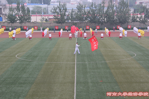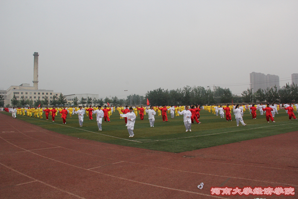 清风徐徐,一扫多日来的燥热。必赢242net代表队作为第19个出场的队伍反而更显从容,450个队员伴随着阵阵铿锵有力的盘鼓声跑步入场。盘鼓响,彩旗扬,必赢242net的大旗迎风舒展,红黄白三色的太极服在操场中间拼出的字母“JJ”是取自经济的字母首拼。鼓槌落,乐声扬,必赢242net的口号响彻操场,《大学》的朗诵声与缓慢的太极相得益彰。同学们缓慢舒展每一个动作组成了整齐划一的节奏,精彩之处,赢得阵阵掌声。