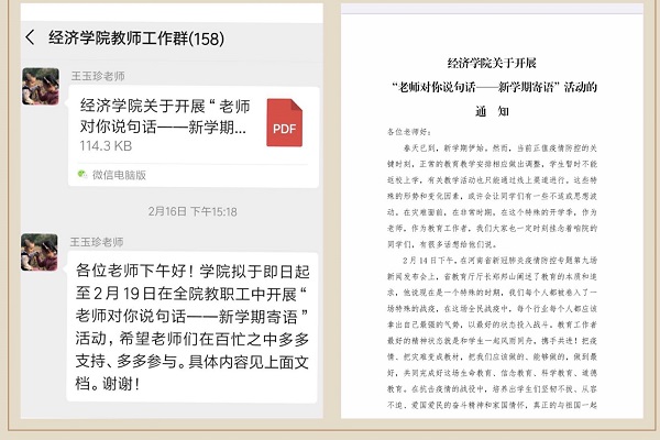 老师们的谆谆教诲、殷殷期望将通过学院官方微信与广大学子见面。希望同学们从老师们的寄语中,感受到学校和学院对他们的真诚关爱,感受到老师们对他们的深切期望,认真积极配合疫情防控工作,珍惜时光、坚持学习,以实际行动回馈老师,展现经院学子的责任和担当。