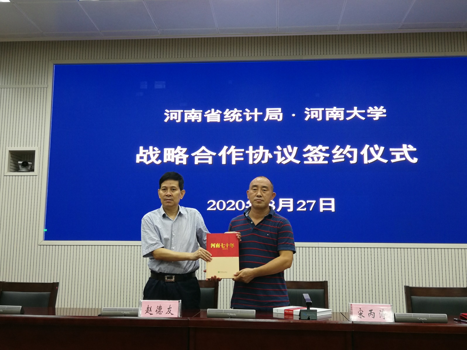 签约仪式结束后,赵德友还向宋丙涛赠送了《统计理论与实践》创刊号期刊和《河南七十年》等资料。