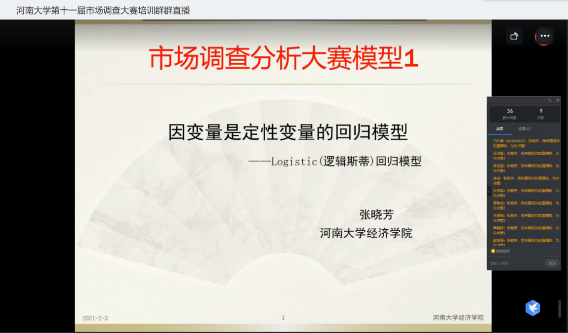 培训会主要环节由指导教师讲解与员工提问答疑组成,根据不同培训内容分为五场进行。首场培训会盛鹏飞老师以“选择课题与研究设计”为题,对市场调查大赛如何选择新颖的调查研究主题与如何设计整个课题调查的计划方案进行了详细指导,并在最后对员工们提出的问题仔细解答。第二场培训会由叶震老师主持,主题为“抽样调查”,抽样调查是在市场调查过程中必不可少的使用方法,叶老师对抽样分类、样本量的确定、网络调查、分层设计等进行了详细介绍。第三场培训会邵明振老师带来了“大赛注意事项与经验分享”,指出了参与市场调查大赛的意义,并以往年实际指导经验详细说明了如何选择体现时代特征的研究主题。第四场余萍老师介绍了“选题方法与问卷设计”,对问卷设计的准备工作、设计要求,问卷分类、设计过程进行了详细指导。最后一场张晓芳老师讲解主题为“Logistic回归模型”,Logistic回归模型是市场调查大赛的常用实证分析方法,张老师先对相关知识进行理论讲述,最后运用SPSS分析软件对前述知识进行了操作举例。