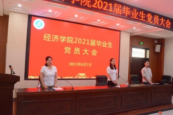 本科毕业生党员代表宋飞燕带领全体党员重温入党誓词,与会党员举起右拳,面向党旗郑重宣誓。