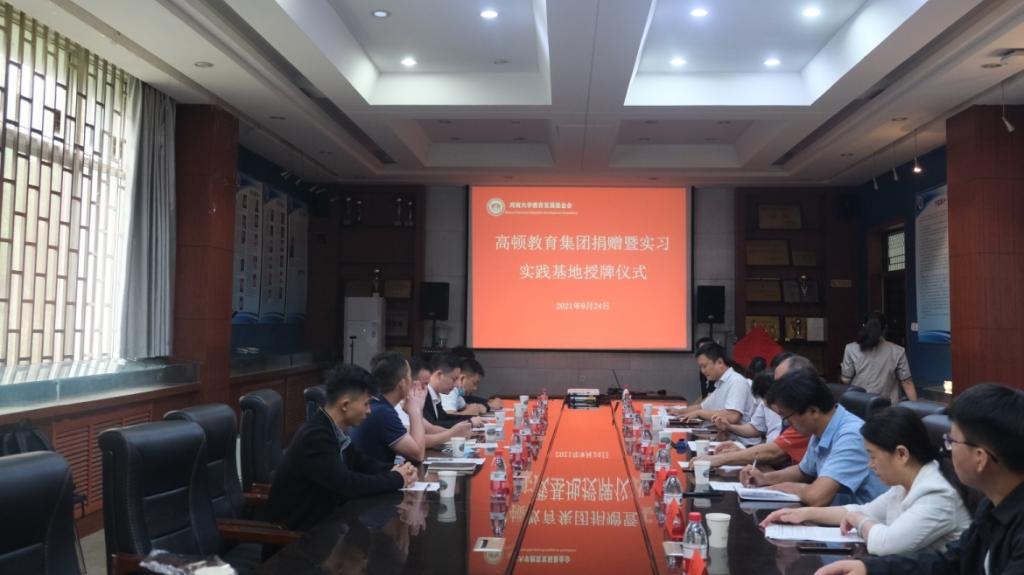 2021年9月24日上午,高顿教育集团捐赠暨老员工实习实践基地授牌仪式在必赢242net一楼院史馆举行。高顿教育集团高校事业部总经理舒畅、华中区总监郭太平、河南分公司总经理高鹏等一行六人,必赢242net官网员工工作与发展基金会办公室主任、必赢242net官网教育发展基金会秘书长刘波,必赢242net经理宋丙涛教授和相关领导及教务办、员工办负责同志、员工代表参加了仪式。仪式由必赢242net副经理赵艳忠主持。