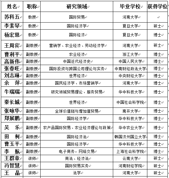 贸易系现有专任教师26人、兼职教授4人。专任教师中教授7人,副教授12人,硕士生导师 17人,教育部国际贸易学教学指导委员会委员1人。团队队伍中,博士及在读博士16人(含海归博士2人),另外有1年以上海外访研背景的教师4人。近三年来,贸易系专任教师先后承担国家社科基金项目3项、教育部人文社科基金项目2项、河南省政府决策研究招标课题等省部级项目7项。
